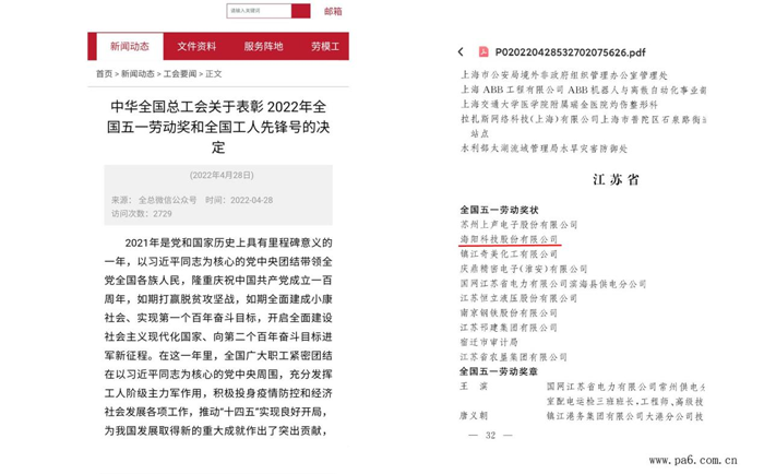 2022年4月28日,根據(jù)中華全國總工會發(fā)布公告,公司股份有限公司(簡稱公司下同)獲評全國“五一”勞動獎狀并受到表彰!江蘇全省僅有9家,泰州地區(qū)一家,全國橡膠行業(yè)僅一個集體和一名個人獲得。